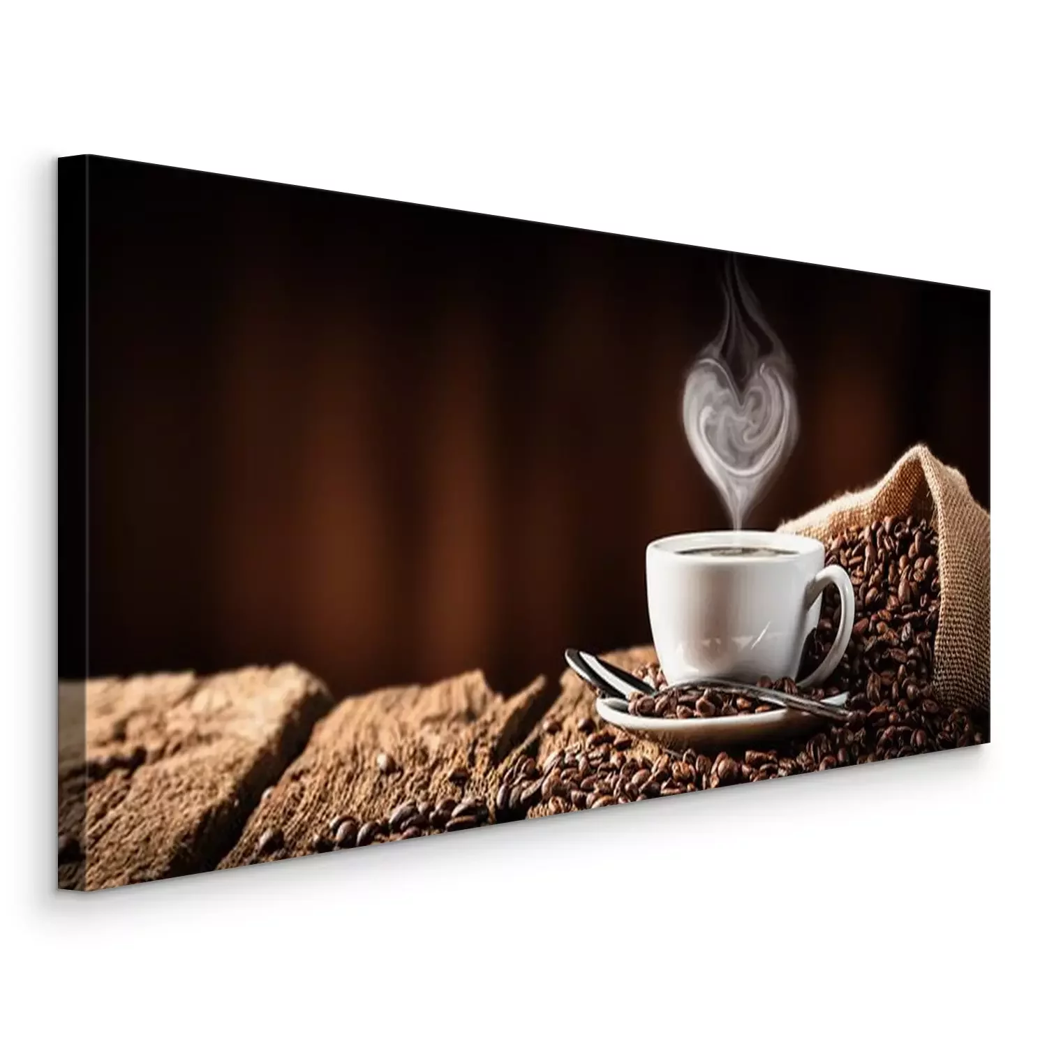 Tableau   White Cup Of Hot Coffee With Heart Shaped Steam On Old Weathered Table With Burlap Sack And Beans