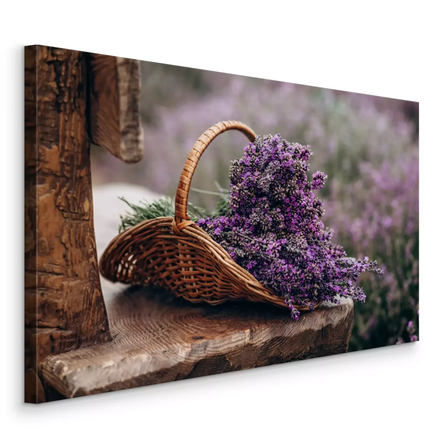 Tableau  Wicker basket of freshly cut lavender flowers on a natural wooden bench among a field of lavender bushes. The concept of spa, aromatherapy, cosmetology. Soft selective focus.