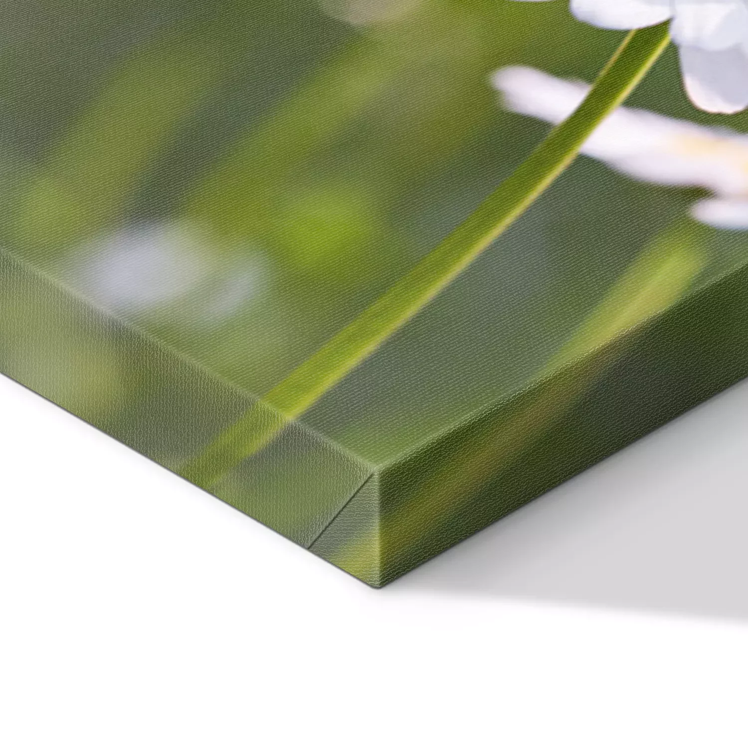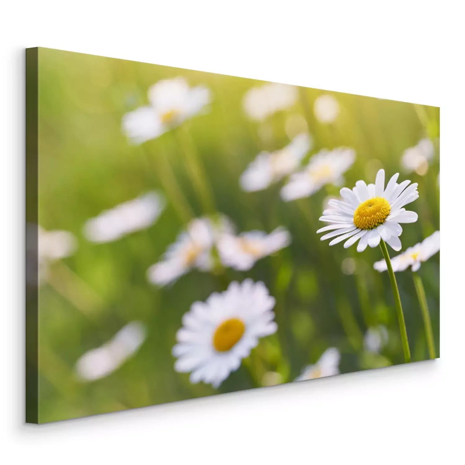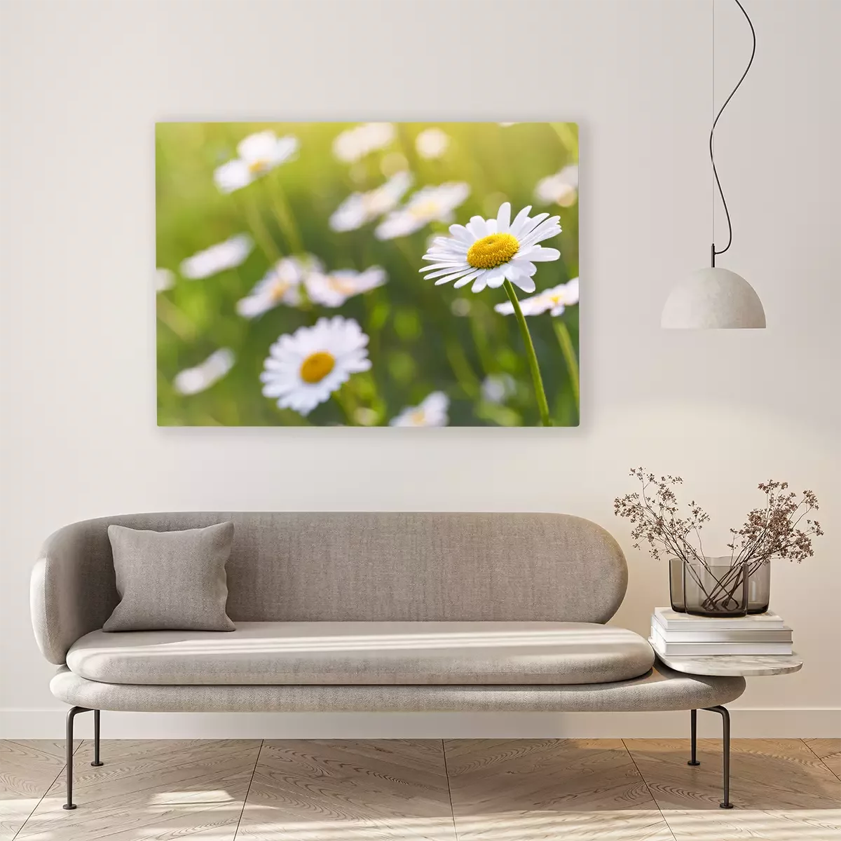 Tableau  Wild daisy flowers growing on meadow. Warm sunny defocused natural background.