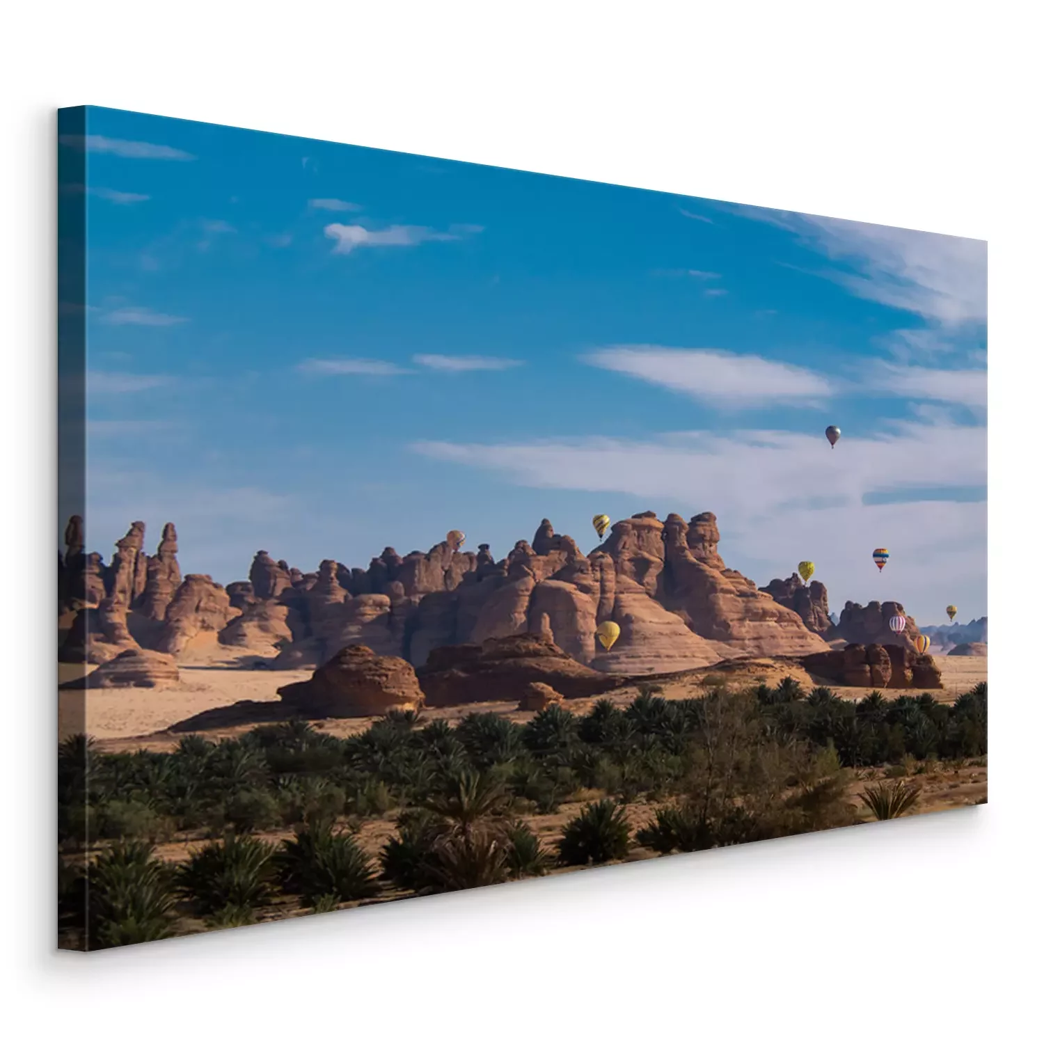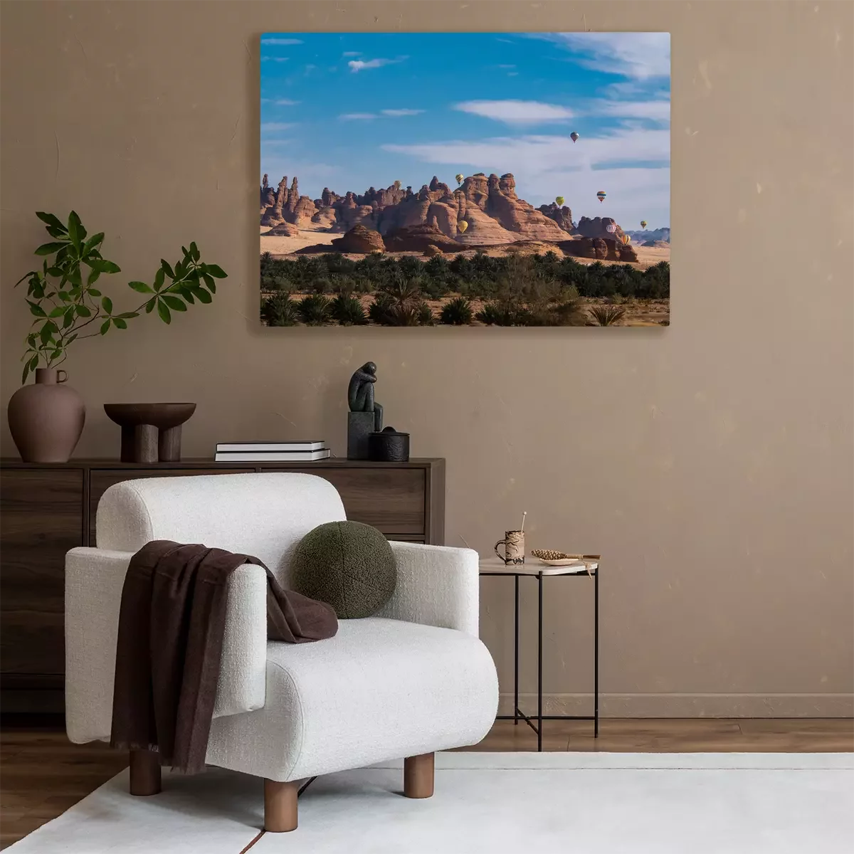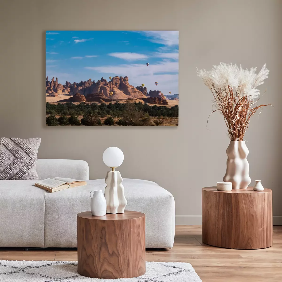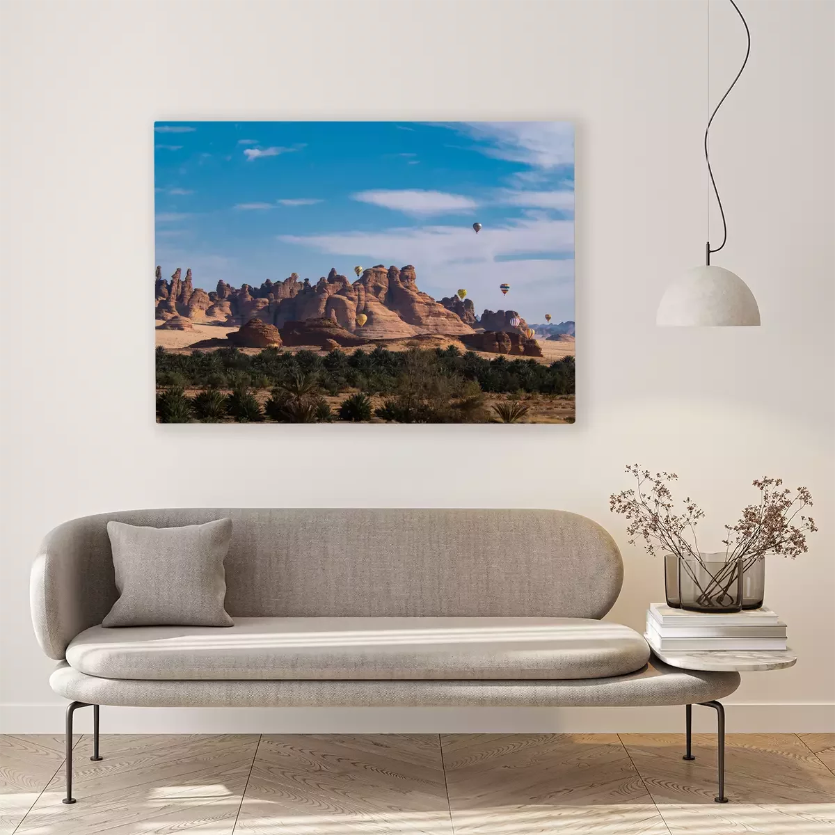 Tableau  Winter at Tantora Hot Air Balloon Festival over Mada'in Saleh (Hegra) ancient site, Al Ula, Saudi Arabia