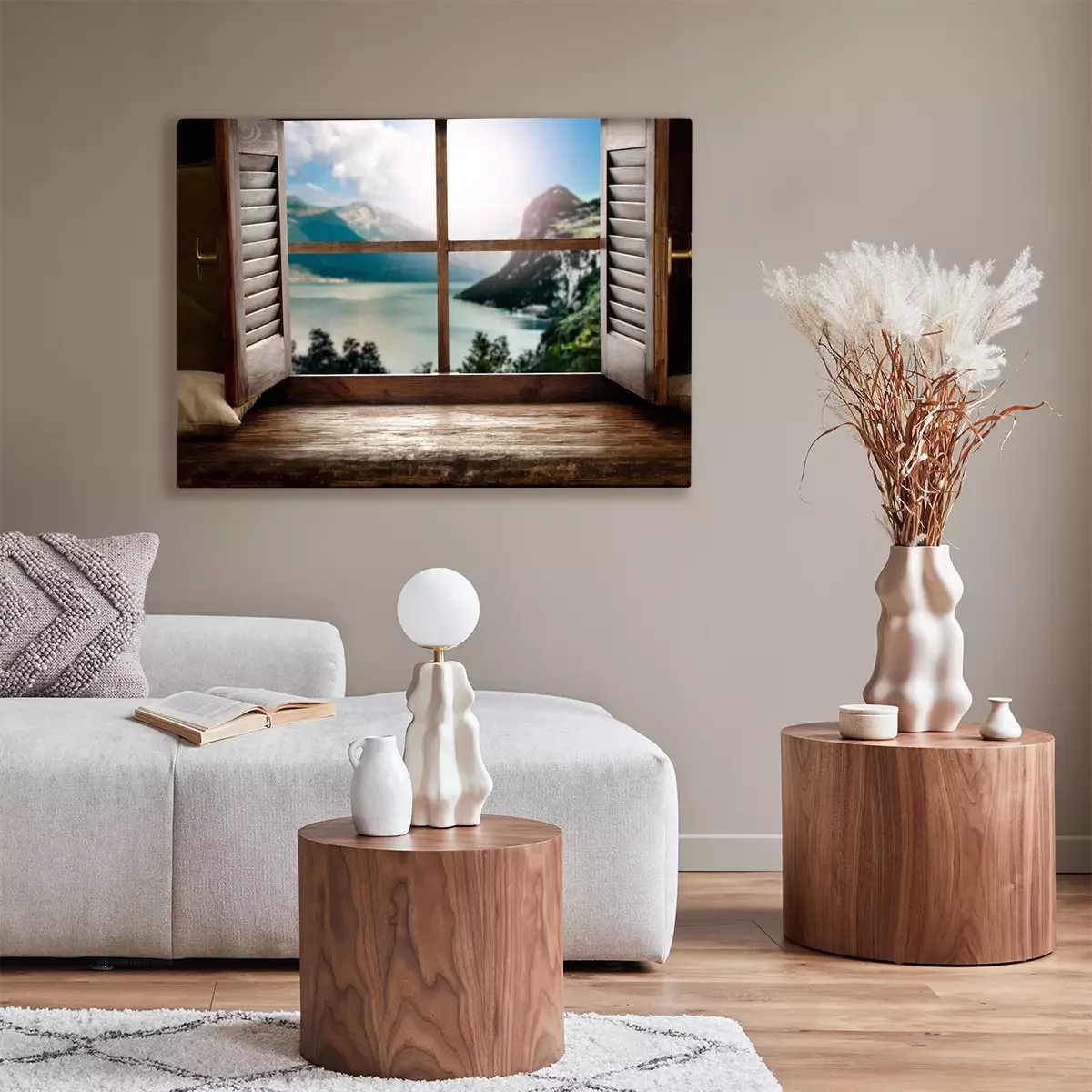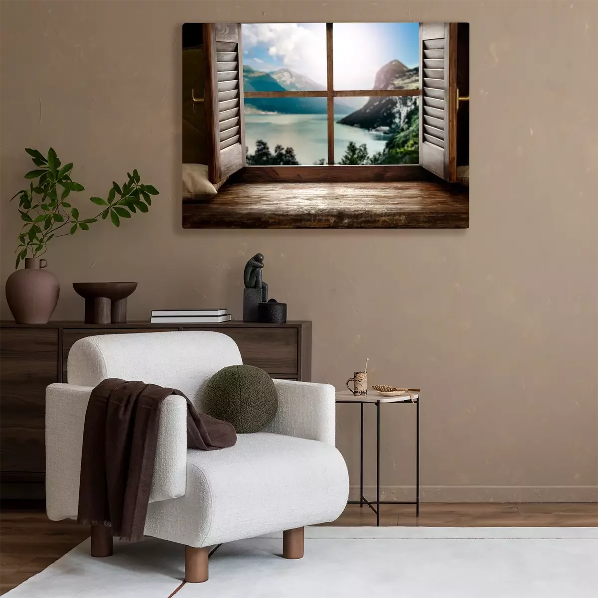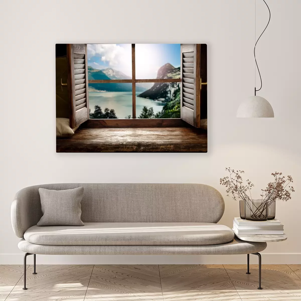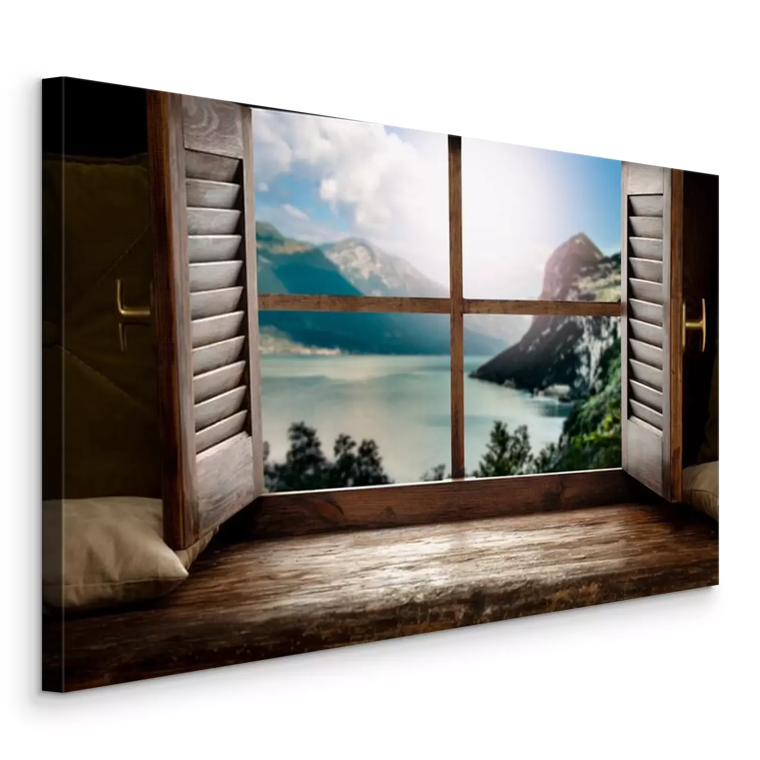 Tableau  Wooden window sill background with pillows and free space for your decoration.Landscape of spring lake with mountains nad copy space