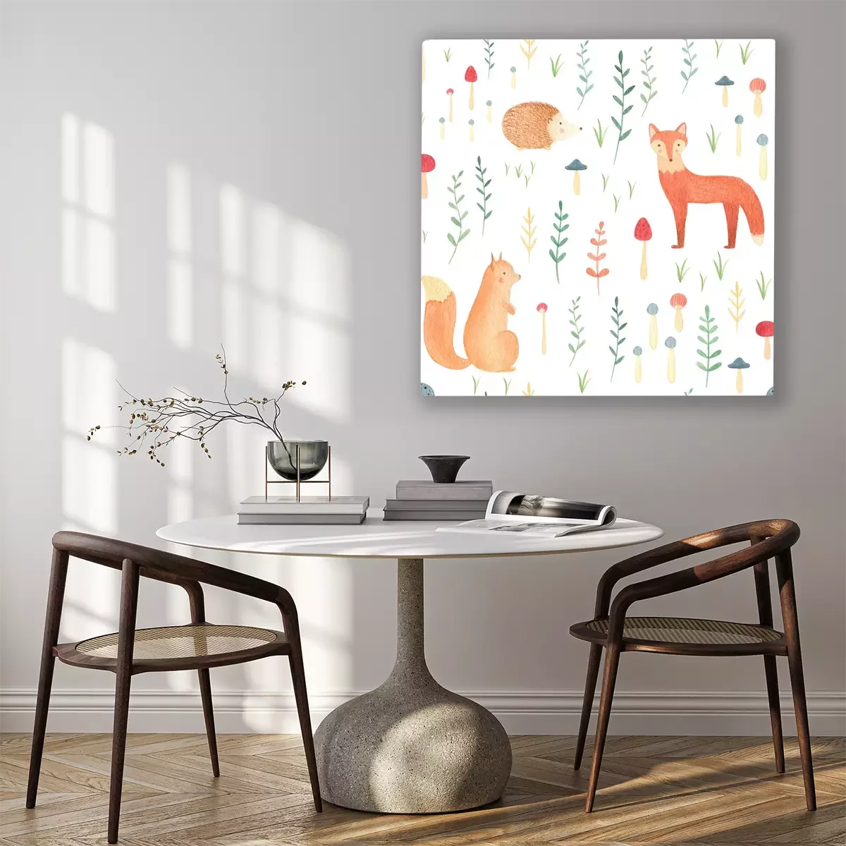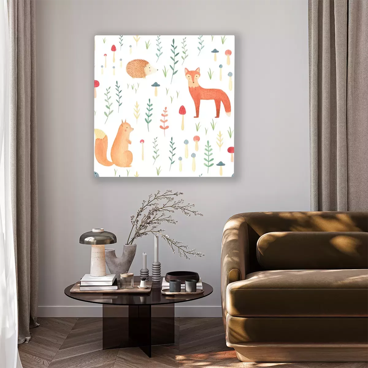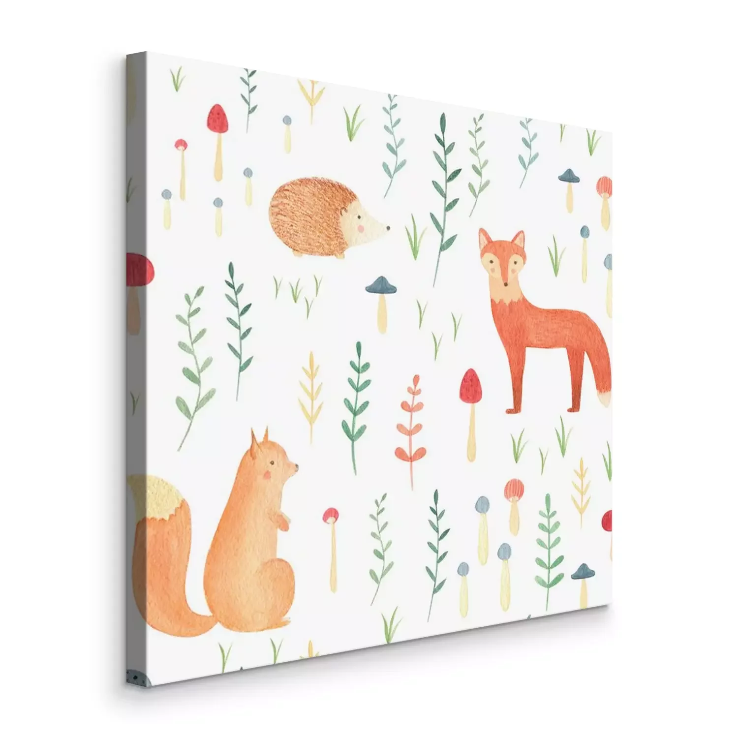 Tableau  Woodland seamless pattern with watercolor hand drawn animals. Cute fox, squirrel, bear, rabbit with forest leaves and mushrooms on white background. Perfect summer print for kids, infants, nursery.