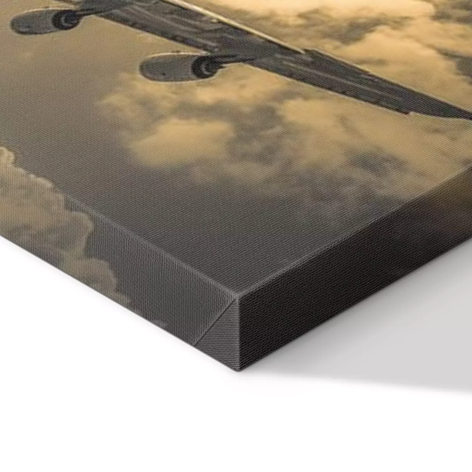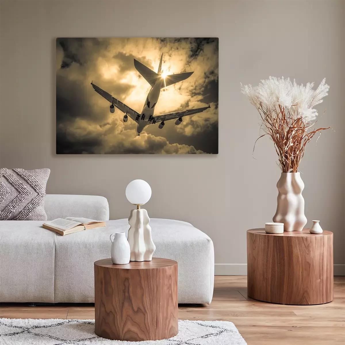 Tableau  avion de passagers d'atterrissage à travers les nuages ​​d'or