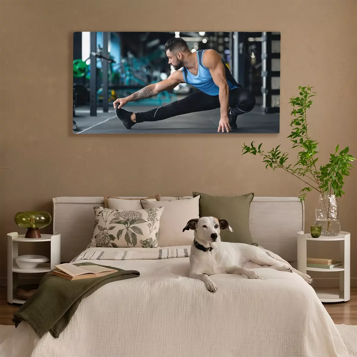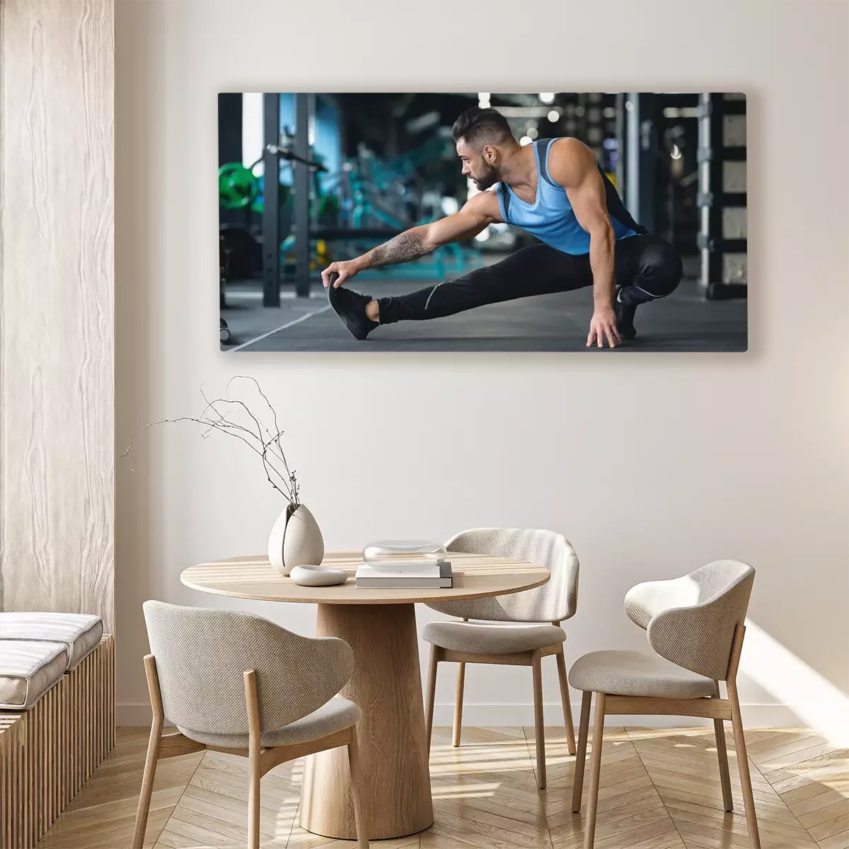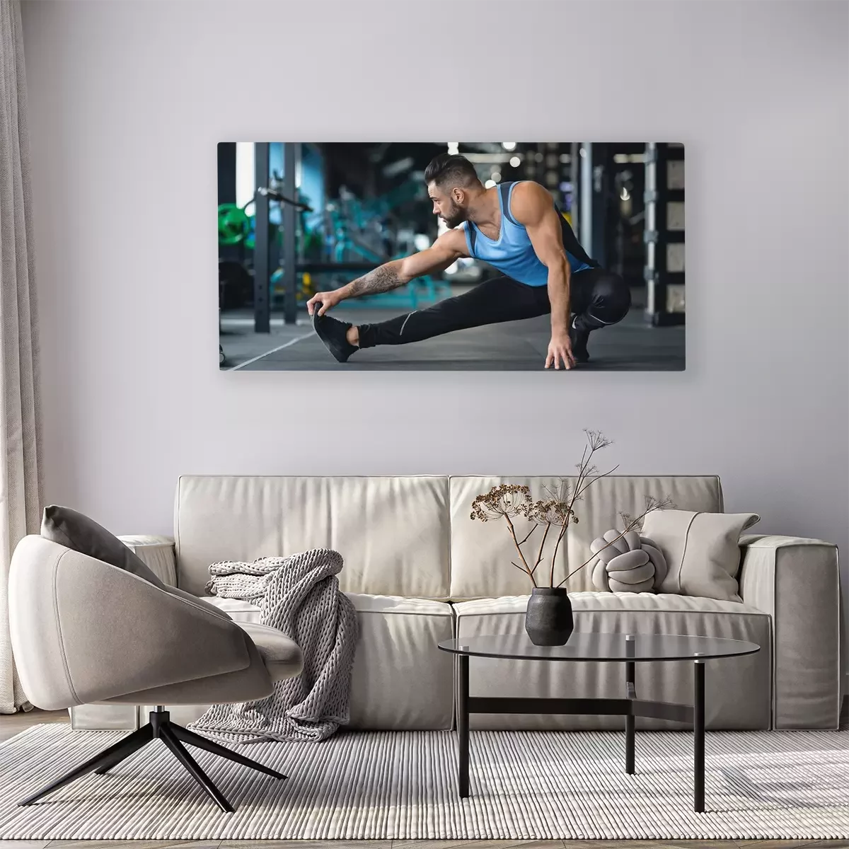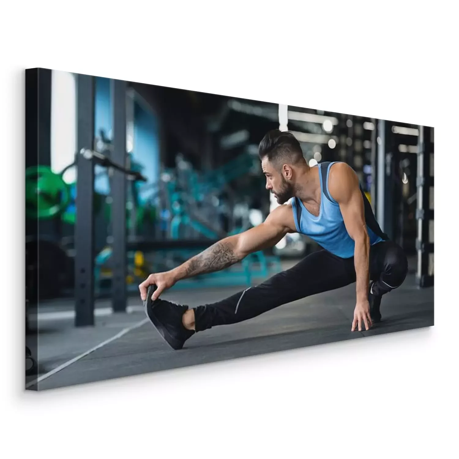 Tableau  Young athlete stretching legs before training at gym