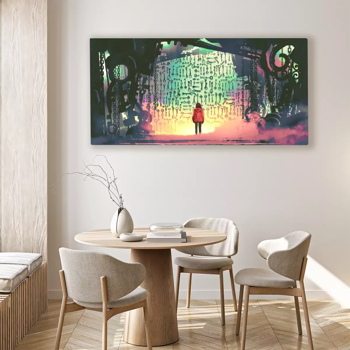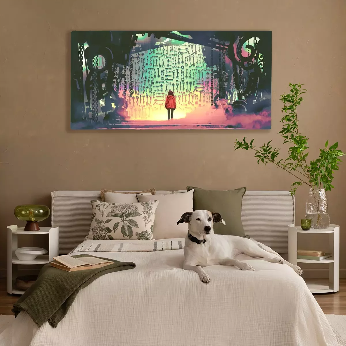 Tableau  young girl looking at a lot of keys on the wall in the steampunk cave, digital art style, illustration painting