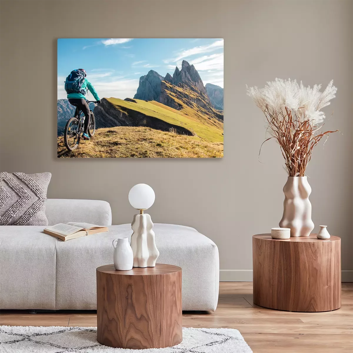 Tableau  Young man with mountain bike cycling on Seceda mountain peak at sunrise. Puez Odle, Trentino, Dolomites, Italy.