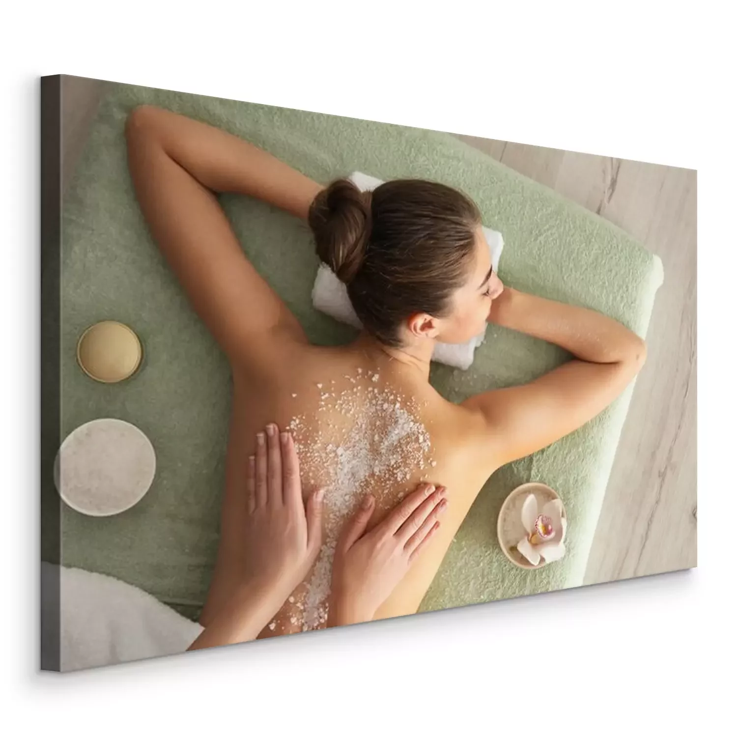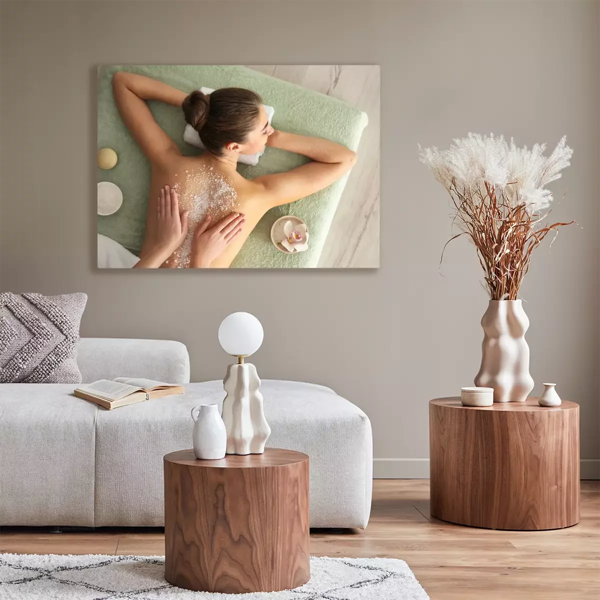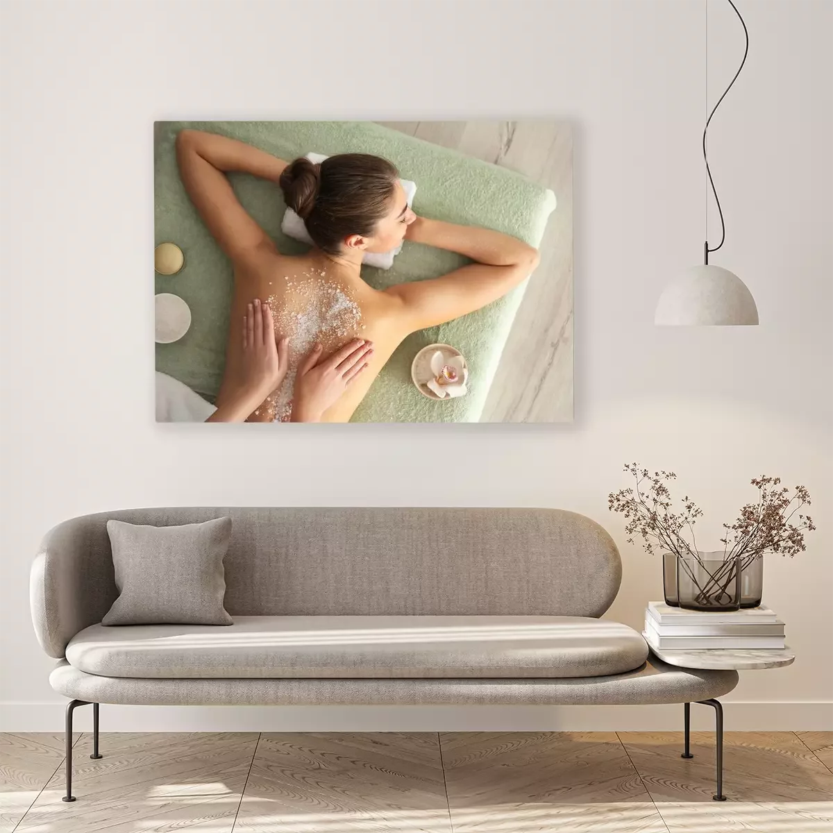 Tableau  Young woman having body scrubbing procedure with sea salt in spa salon, top view