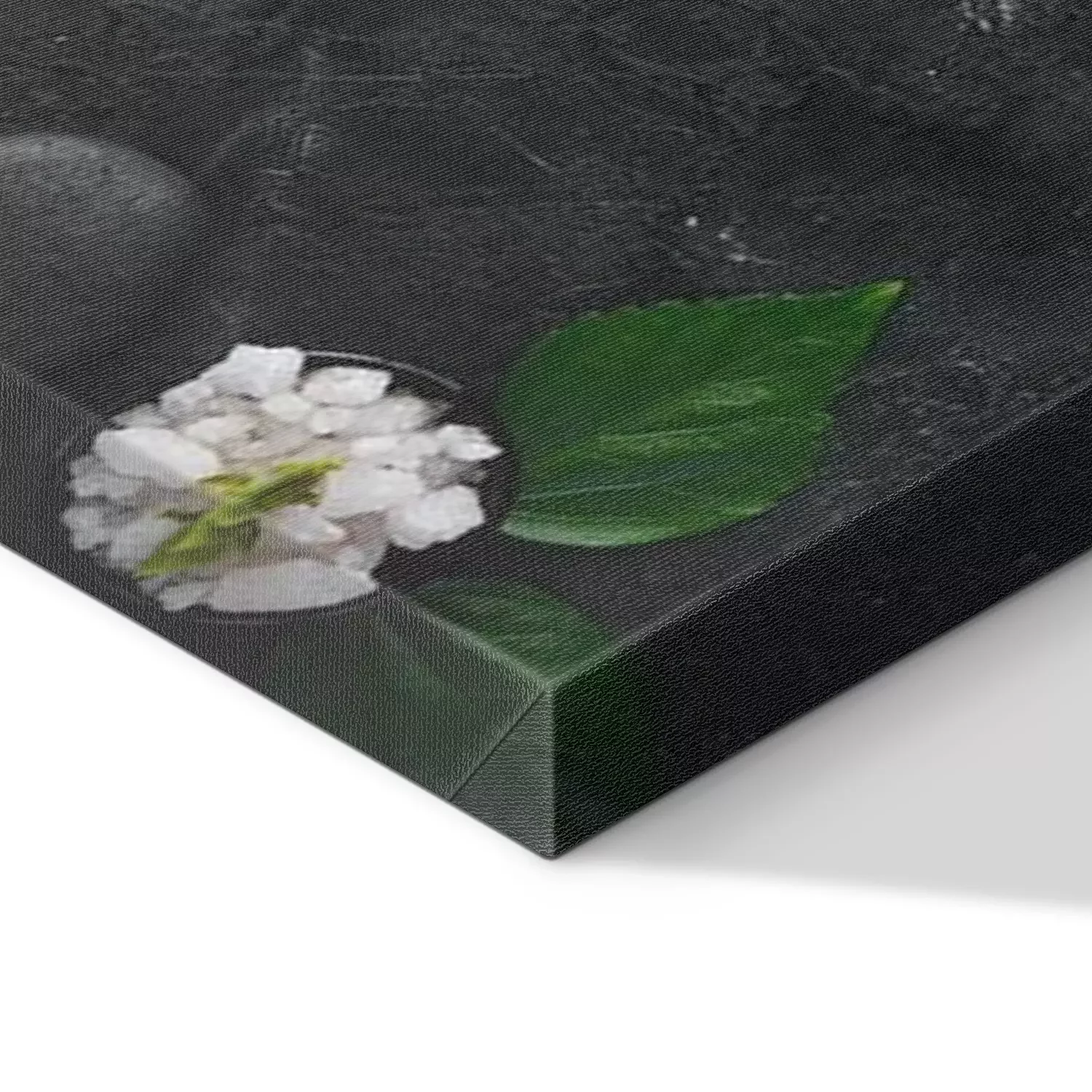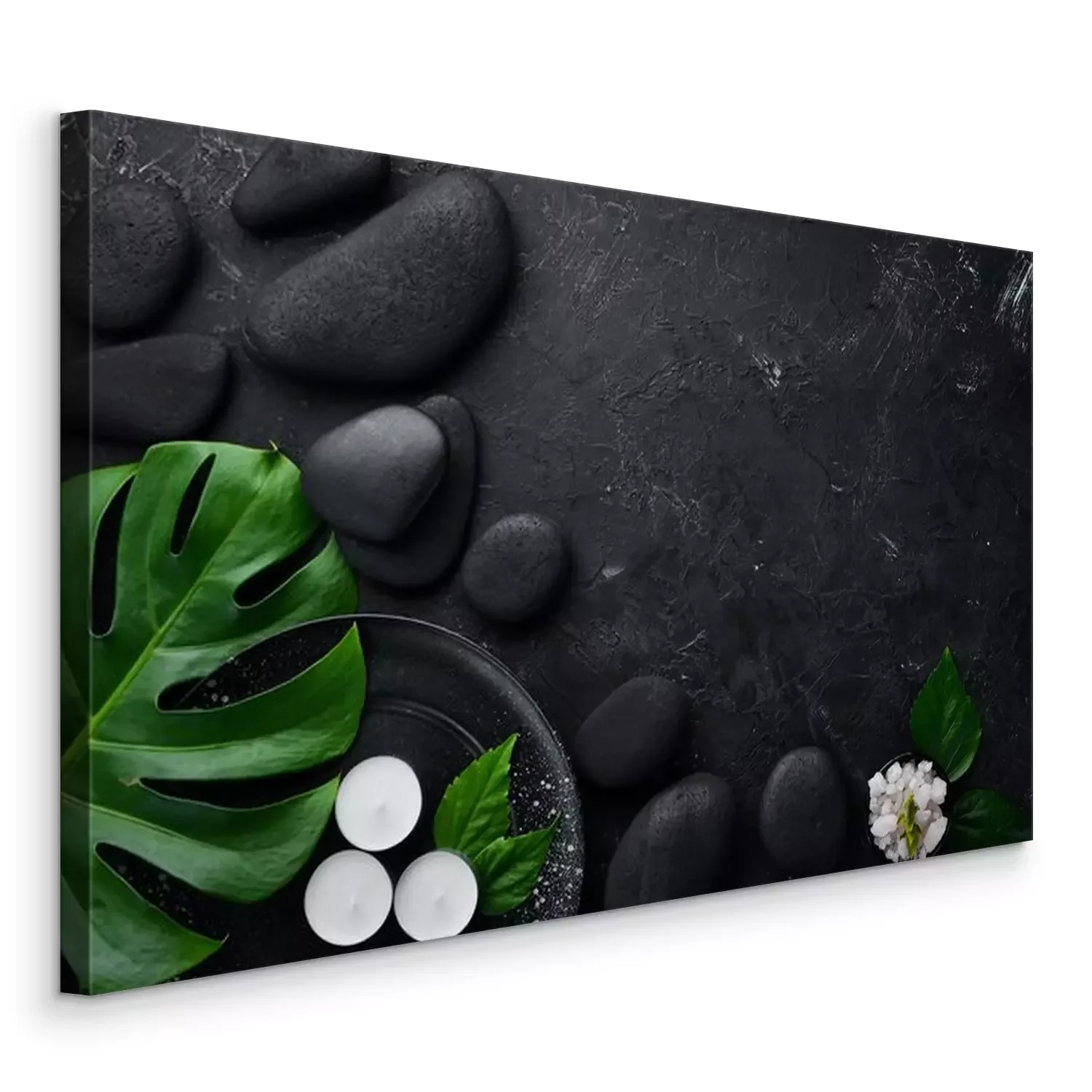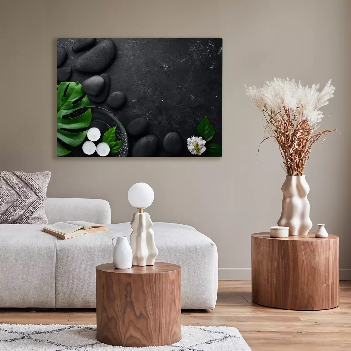Tableau  Zen stones and leaves with water drops. Spa background with spa accessories on a dark background. Top view. Free space for your text.
